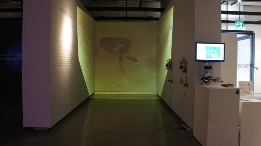 As Europeans colonized the Americas, the newly invented microscope led to the discovery of another new world that shifted Western understandings of existence. As Leibnitz noted “There is a prodigious quantity of [living things] in a drop of water tinctured with powder … perhaps the block of marble itself is only a mass of an infinite number of living bodies like a lake full of fish” (1687). Microscopy also contributed to a reductive view of water that is tied to ecological devastation. Emerging from the Water offers an Anishinaabe perspective, asking audiences to re-imagine what water policies, sciences, and human relations with the more-than-human world could look like in a decolonized world. The accompanying interactive microscope features water samples from the St. Lawrence River — a significant trade route for Indigenous peoples, and an artery for colonization in Canada.