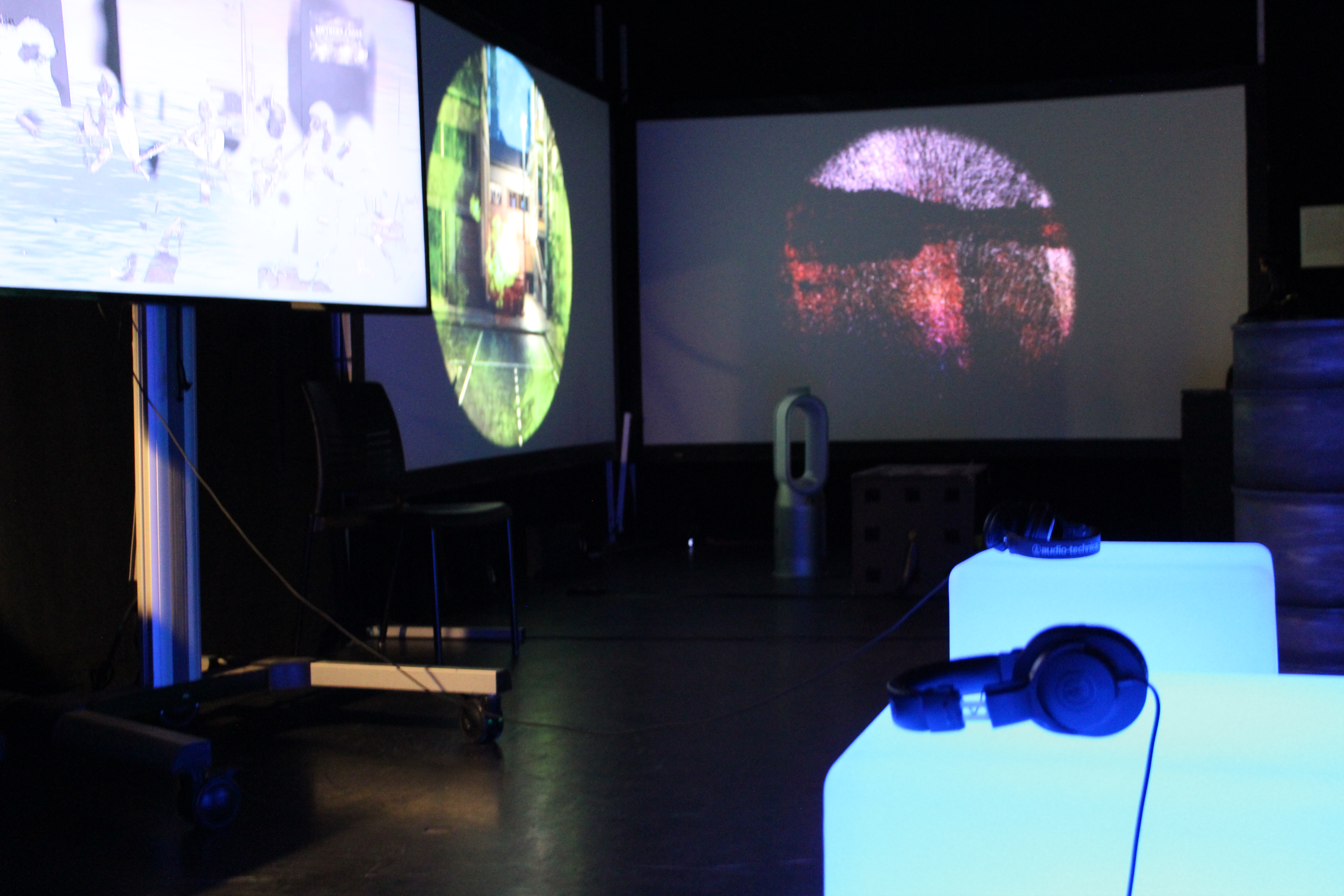 Particulate Matter x Midge Swarm is an interactive dual-channel projection responding to the environmental crisis in Sarnia’s Chemical Valley—home to Canada’s worst air quality. The project reflects on the harm caused by petrochemical industries, particularly to the Aamjiwnaang and Walpole Island First Nations. In Particulate Matter, viewers control a digital smog screen with an throttle controller, revealing a surreal industrial landscape—refineries, flare stacks—while triggering haunting sounds: sirens, local voices, and media clips. Midge Swarm, in contrast, immerses viewers in a vibrant wetland alive with midges, birds, and cattails. As people move, they animate a swarm of digital insects—reminders of the life still resisting. Together, the projections form a conversation between destruction, colonial extraction, environmental racism, resilience, and hope, asking viewers to recognize their own place within it.
